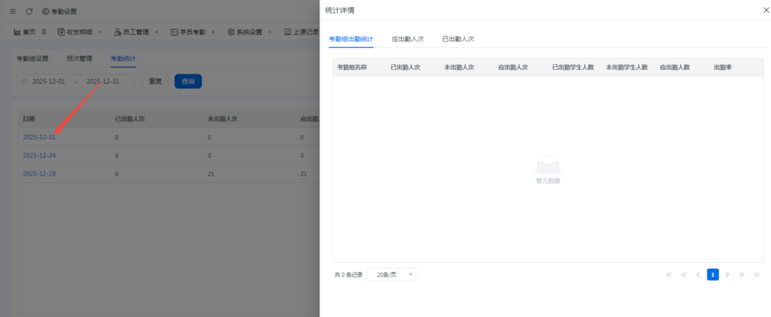 3.考勤记录中可查询到学员每日的出勤情况,每个考勤规则下的应出勤人员名单及未出勤人员名单