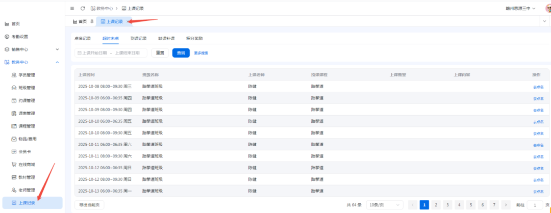 二,可按照超时未点名筛选上课记录