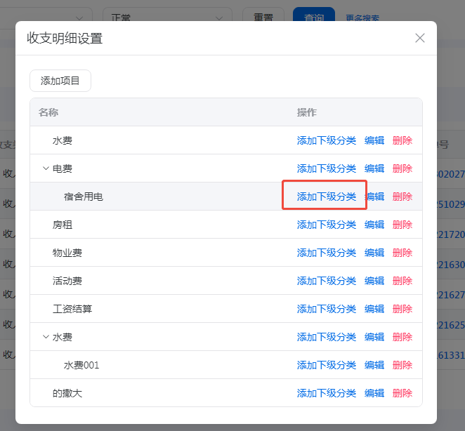五,新增收支项目可添加上下级