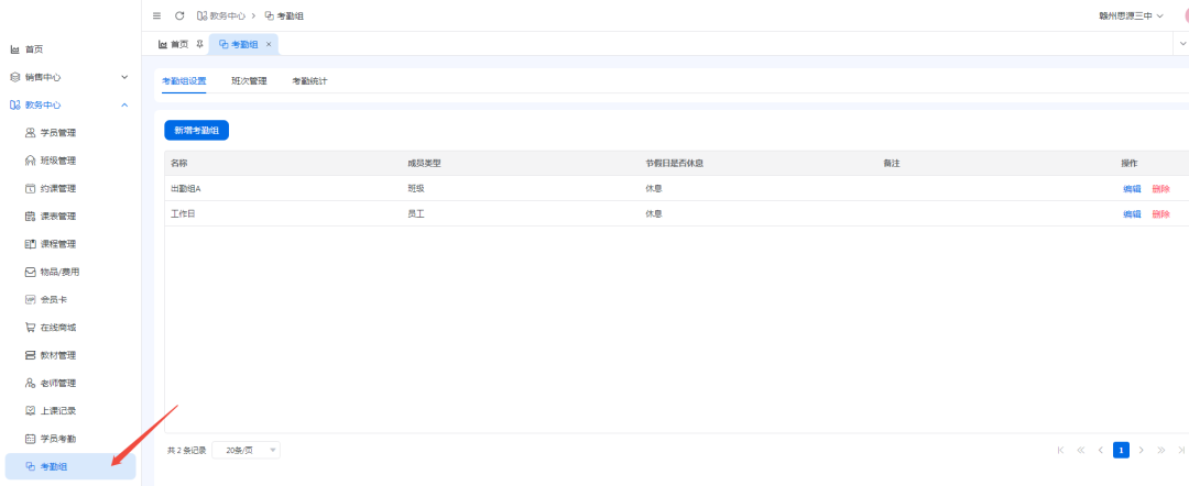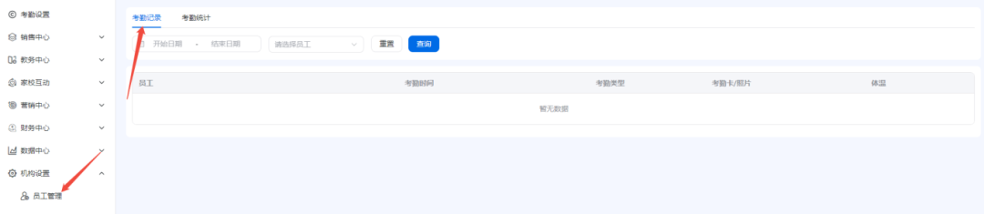 注:如设置员工考勤组,则考勤记录需要在员工管理——老师考勤中进行查询