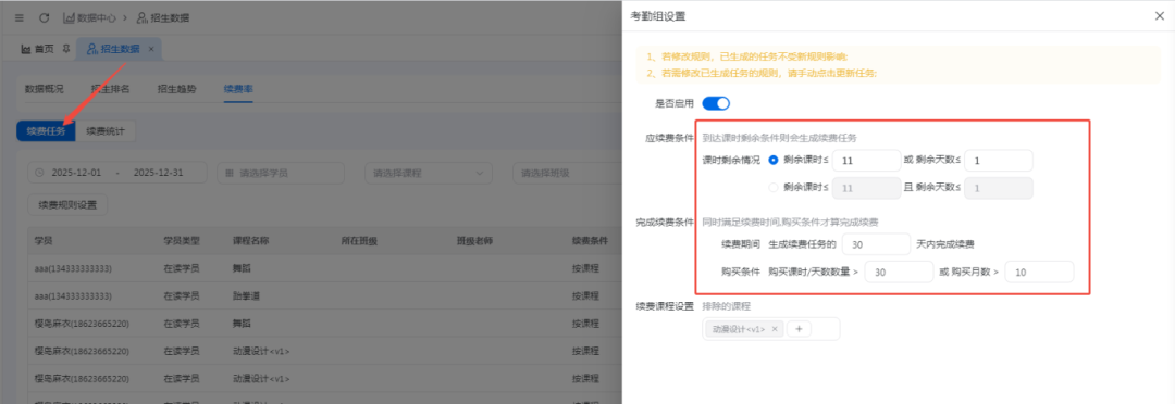 1.设置续费统计规则,规定学员课时数/剩余天数少于设定阈值后触发续费任务,在规定有效期内完成续费,则系统判定该学员续费任务完成;