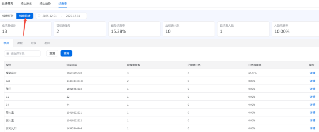 2.续费统计中,可以查看学员具体的应续费任务项,已完成续费任务项,续费率等数据;