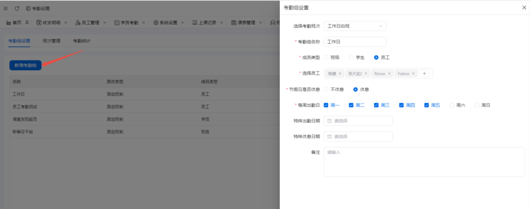 2.新增考勤组,设置好关联的考勤班次,适用范围(可在学员,班级,员工中进行选择),适用的具体日期,若有特殊日期可进行额外填写,最后保存,学员或者员工在规定时间内进行刷脸即可完成考勤。